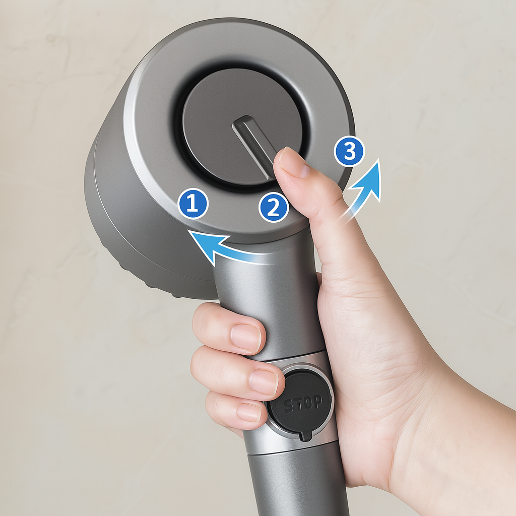 🔄 Cambia el modo de chorro : Gira la parte frontal del cabezal para elegir entre lluvia, masaje o mixto.