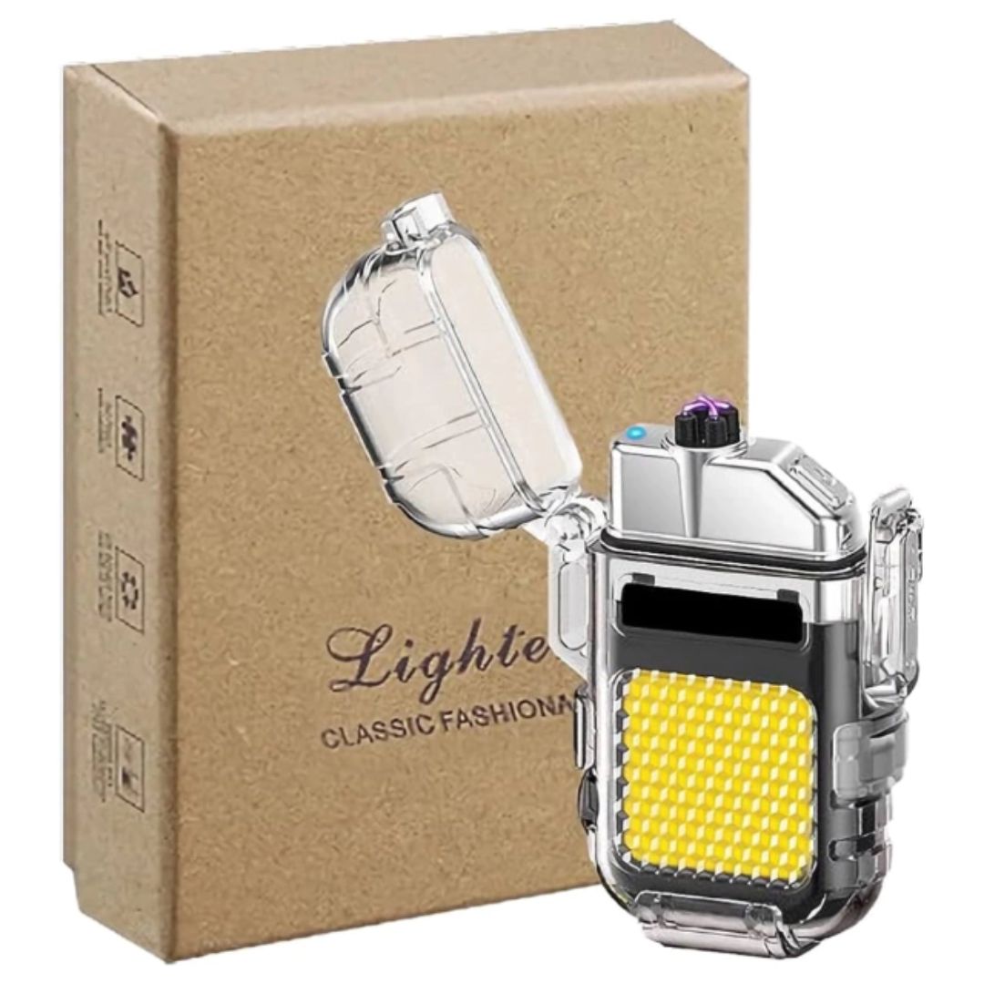 Encendedor eléctrico de arco recargable, resistente al agua y viento, con linterna LED integrada. Compacto, seguro y ecológico, ideal para camping, senderismo y aventuras al aire libre. Carga rápida, diseño duradero y versátil. ¡Tu compañero perfecto en cualquier clima!